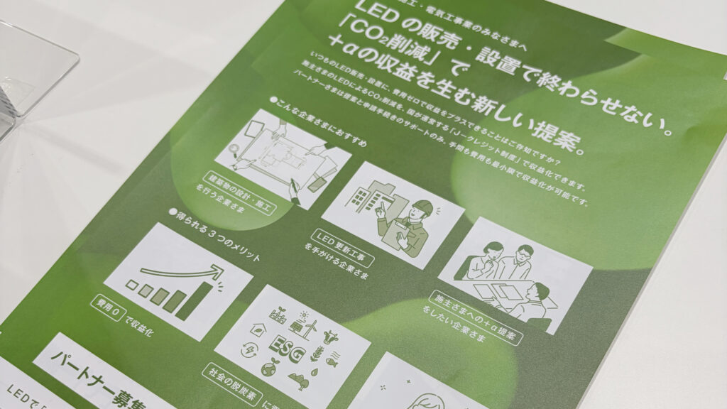 LEDやEVの導入によるCO₂削減を、国が運営する「J-クレジット制度」を活用してクレジット化・収益化する本取り組み。ブースでは「CO₂削減を収益に」というキーワードを掲げ、キーカラーであるグリーンを基調とした空間を展開しました。